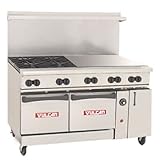 Are you looking for the best review for Vulcan-Hart 60-SC-4B-36G-P 60" Open Burner/Griddle Endurance Restaurant Range? Read customer review, features, specifications, description, check prices update and more satisfying for Vulcan-Hart 60-SC-4B-36G-P 60" Open Burner/Griddle Endurance Restaurant Range product reviews! The 60" Open Burner/Griddle Restaurant Range (60-SC-4B-36G-P) is a superior unit based on the reputation of Vulcan-Hart dependability and innovation. Made entirely from stainless steel, this large unit permits high output for busy, demanding establishments. The range top is a standard open burner gas range with heavy-duty cast grates which lift off to facilitate cleaning. To the right of the range, a 36-inch manual griddle makes this unit a multifunctional addition to your kitchen. The base of the unit is a combination oven; 1 standard baker’s depth oven and one convection oven complete the unit. Vulcan-Hart’s legendary precision has been a primary part of the business’ ideals for years, and this quality range can benefit your operation as well. Features: 3 racks included, 4 rack positions, Fully MIG welded frame, Stainless steel construction, Heavy-duty lift-off cast grates, Oven thermostat adjusts from 250° F – 500° F. Benefits: Cool-touch control knobs and oven handle, High shelf lifts off depending on your application, Extra-deep pull-out crumb tray facilitates cleanliness, Extra-deep back grates accommodate larger pots and pans, Oven controls mounted in insulated side compartment to stay in cool zone. Additional Considerations: This product is not intended for home use, Specify altitude if unit will be placed above 2, 000 feet, For additional options and accessories, contact a sales representative at 1-877-877-4379 Monday through Friday 6: 30am – 6: 00pm MST. .