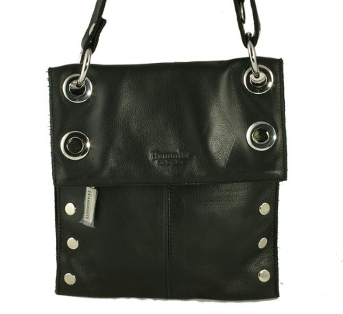 Black Little Santa Monica Crossbody Bag by Hammitt Los Angeles?Hammitt Los Angeles' Little Santa Monica adjustable strap crossbody bag is easy to wear and great looking too! Designer Stef Hammitt has updated the messenger bag with bold, silver colored, polished metal studs and squared it off to give this purse an edgier look. The strap can be hooked to wear it with a 19 inch drop or a 21 inch drop. Like all Hammitt handbags, this crossbody is made of the highest quality leather; it's rich, thick, and sumptuous. The interior of all Hammitt signature handbags are lined with suede. Smaller than its sister bag, the Montana, the Little Santa Monica has two exterior zippered pockets, one on the outside and one in the flap. Inside the side pockets you will find two open pockets for your cell phone and PDA device. The handbag's relaxed feeling is accentuated by the raw edge - there is a little "Los Angeles" stitched into every bag. Made in America.