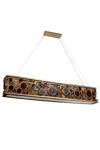 Fascinator Linear Pendant, SIX LIGHT, KOLORADO?Inspired by the ruins of an old Nevada mine at sunset with walls constructed of mud and wine bottles, the Fascinator Linear Pendant mimics the bottle ends with recycled steel circles of varying size that are filled with recycled glass discs. This pendant will complement any home's decor. Order yours today. Recycled steel. Recycled clear glass. Low-VOC finish. Actual size is SIX LIGHT