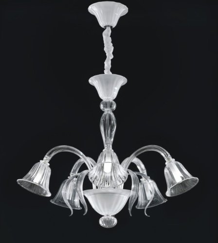 #Traditional style. Requires five 60 watt T4 halogen type bulbs. G9 base bulbs. 120VAC voltage. Hand crafted venetian glass. Clear and frost crystal blown glass diffuser. North American Standard certified. cCSAus safety approved. Chrome color. Made in Italy. Minimal assembly required. 23.5 in. Dia. x 27.5 in. H