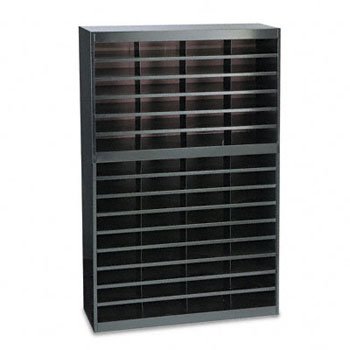 Steel/Fiberboard E-Z Stor Sorter, 60 Sections, 37 1/2 x 12 3/4 x 60, Black?Store and organize forms, catalogs, brochures. 3" high filing space per compartment. Quality-built with steel frame, shelves and vertical dividers and solid fiberboard back. Interlocking design of the shelves and dividers add extra strength to hold up to the heaviest load. Literature Sorter Type: Open Front; Number of Compartments: 60; Compartment Size: Letter; Material(s): Fiberboard Back/Steel.